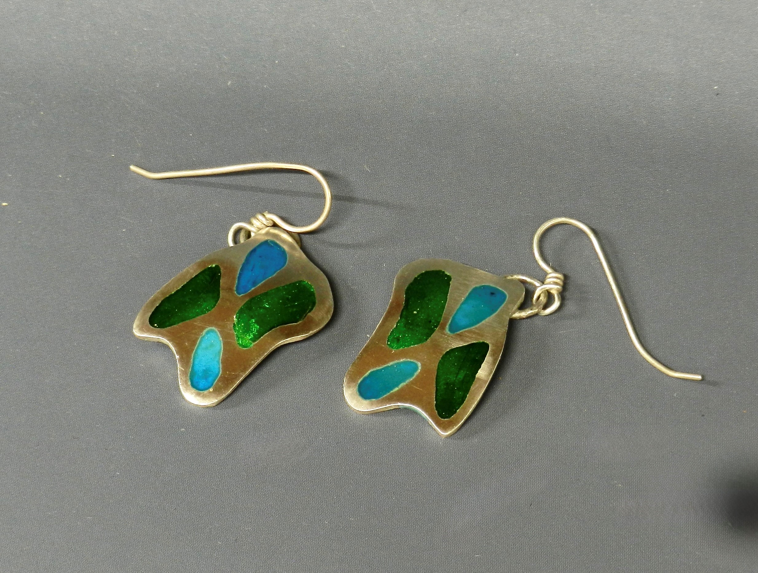 Champleve Earrings in blue and green enamel in Fine Silver on Sterling Silver Earwires