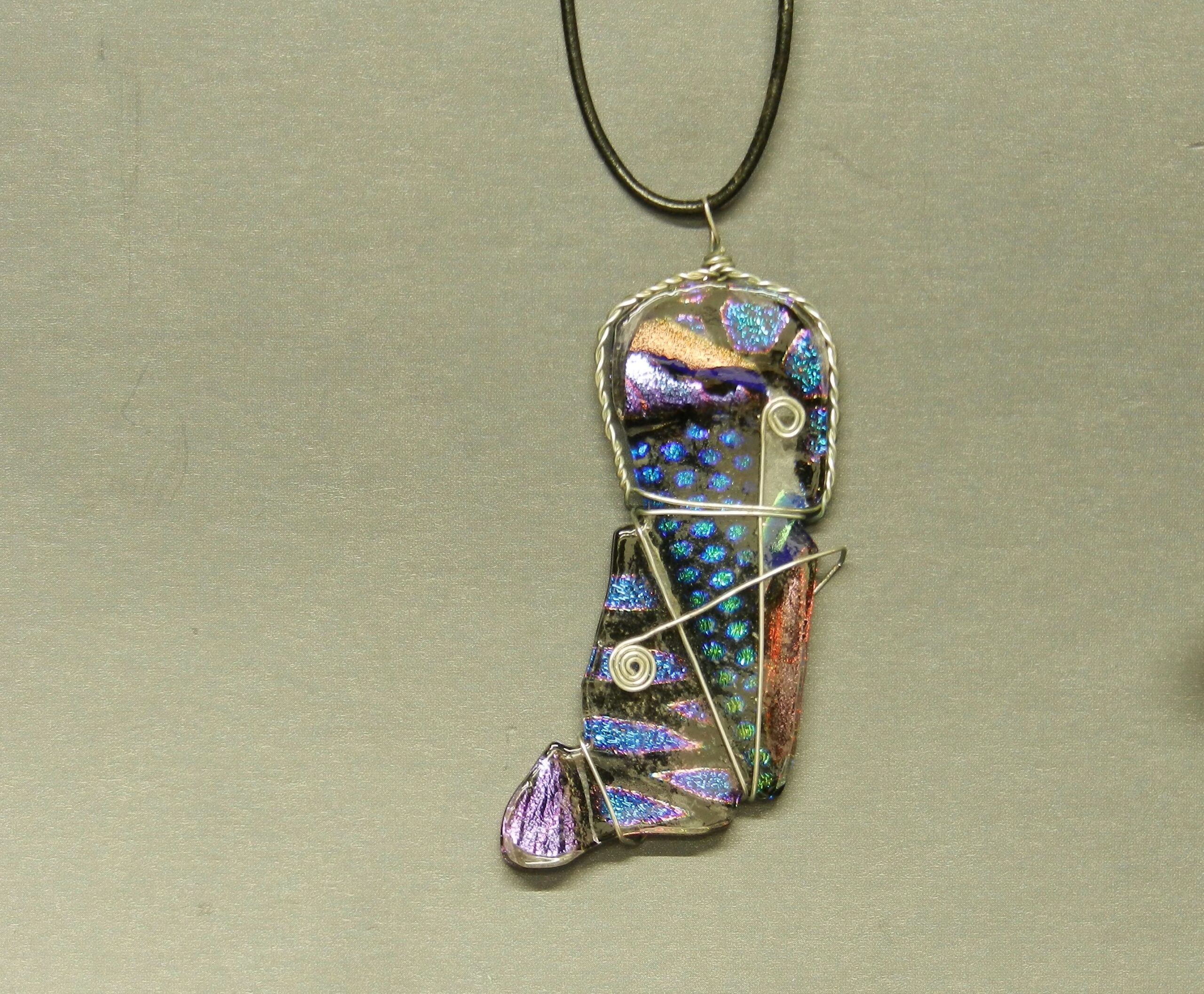 Wire wrapped boot shaped dichroic pendant