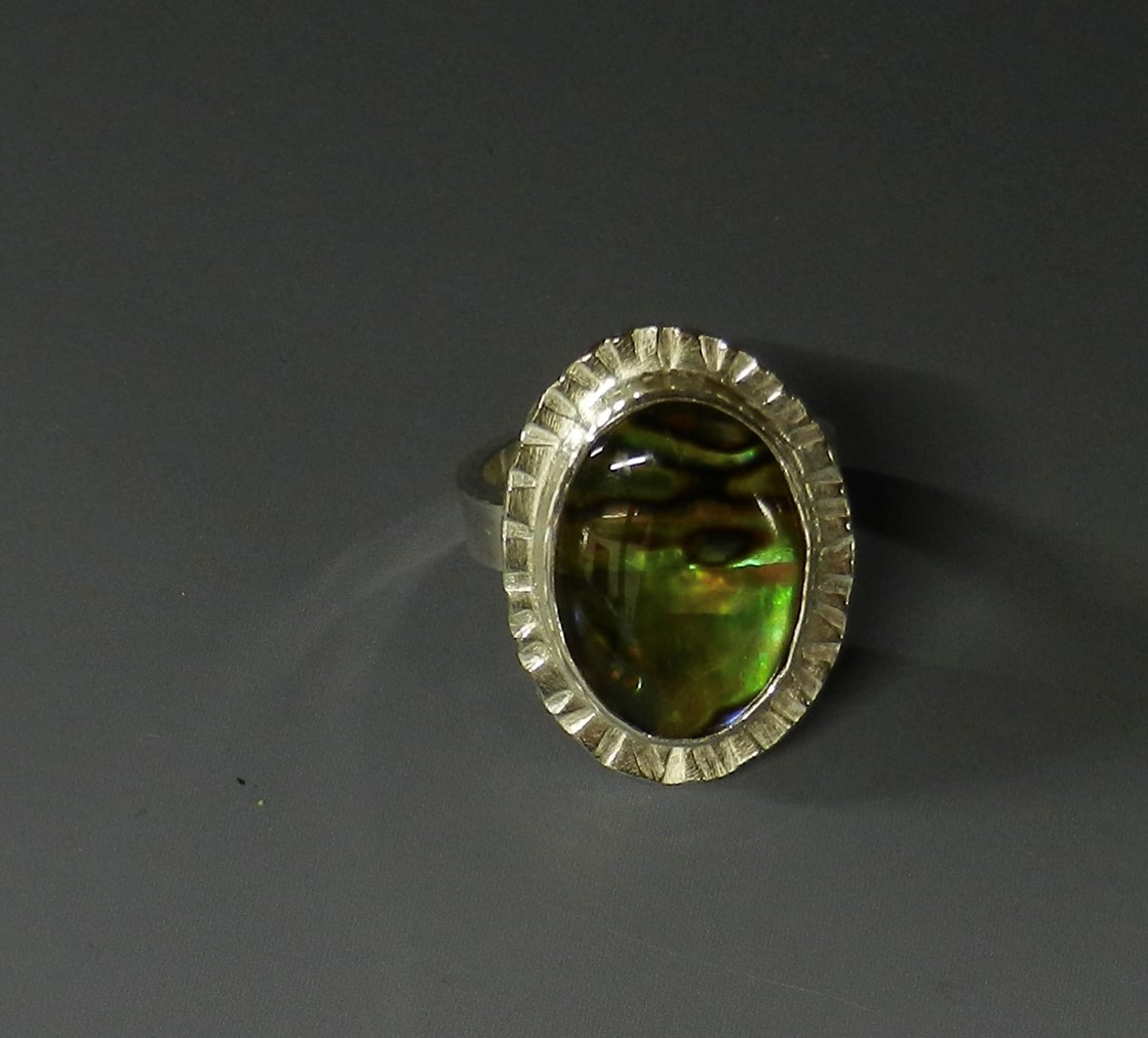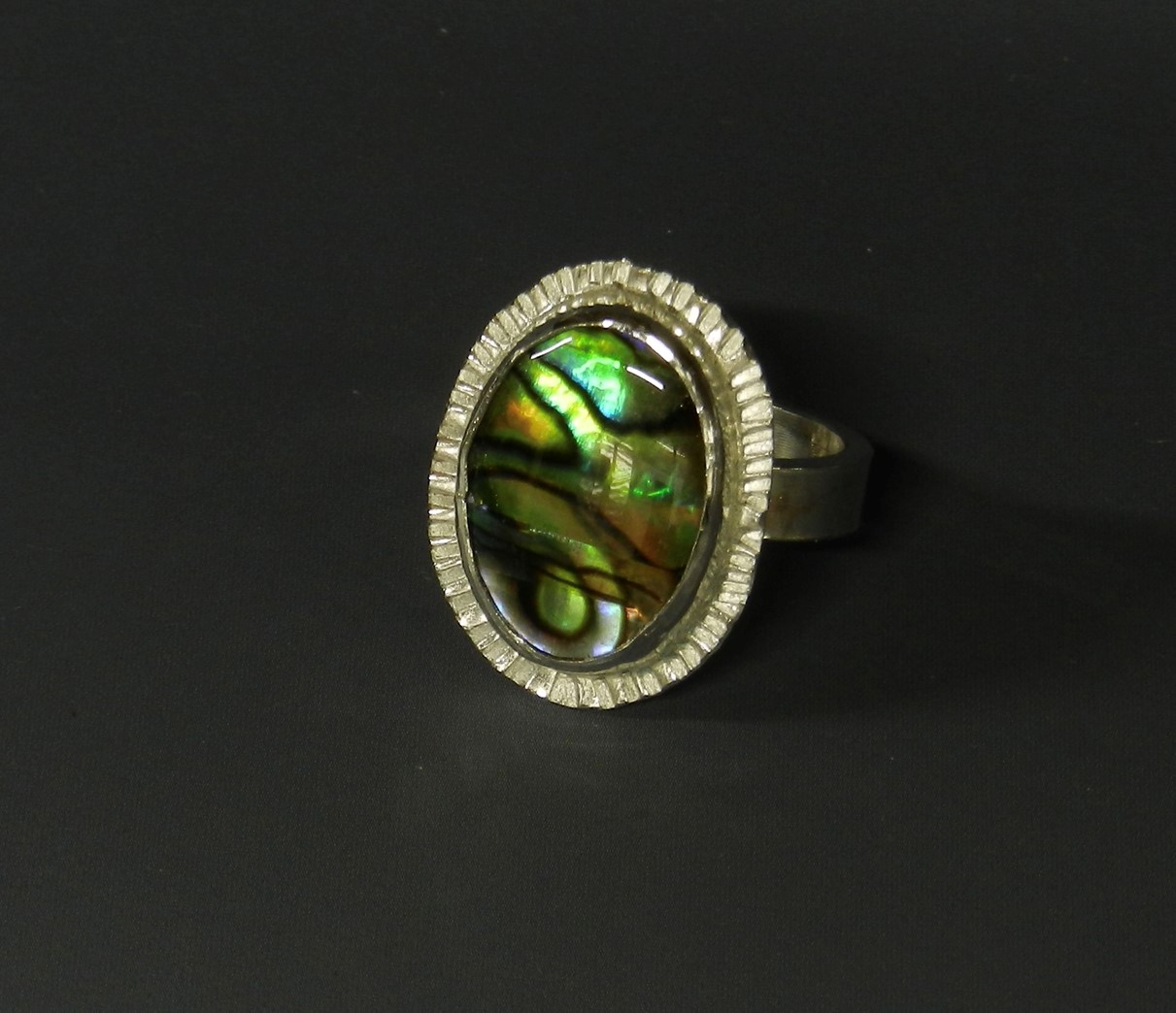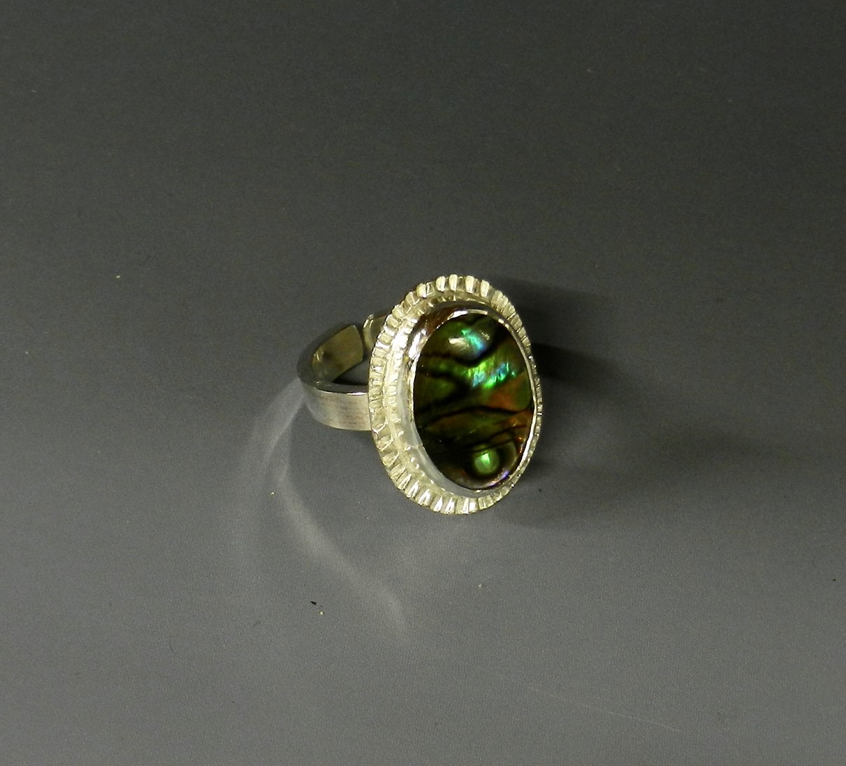 Small Green Paua in Fine Silver on .925 Open Shank Ring