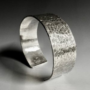 The stone is a denim lapis cabochon. It is set in Fine Silver, 99.9% pure silver, and on a back plate and bail of Sterling (92.5% pure silver).